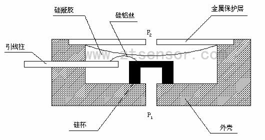 通過硅平面集成工藝技術(shù)在硅片上制作四個擴(kuò)散電阻作為應(yīng)力敏感元件,用機(jī)械研磨加各向同性化學(xué)腐蝕方法將硅襯底加工成周邊固支的平膜片彈性力學(xué)結(jié)構(gòu)。四個力敏電阻,連成惠斯頓全橋應(yīng)變電路,這種電路具有最高的靈敏度、最好的溫度補償性能和最高的輸出線性度。硅杯受到一個差值壓力,力敏電阻的電阻率改變,引起電阻阻值改變。電阻率的改變是由于硅膜片的形變引起的,測試端P1與引壓端P2的壓力差與硅膜片的形變成正比,也就是電橋的輸出與壓力差成正比。
