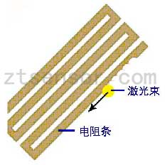 通過薄膜補償電阻網(wǎng)絡(luò)的組合,可以將傳感器的零點控制在±2000μV范圍內(nèi),但傳感器的零點輸出要求滿足±500μV要求。而且傳感器經(jīng)過高低溫、加載疲勞、長期的零點時漂后,還要保證輸出在±500μV內(nèi),這需要在傳感器的裝配、調(diào)試過程中反復(fù)補償。僅通過電阻組合或外并電阻補償,工藝調(diào)試量大,也很難準(zhǔn)確到位。在本項目中,加入了先進(jìn)的激光調(diào)阻工藝,對電阻條的阻值進(jìn)行修正。激光調(diào)阻示意圖如圖2。